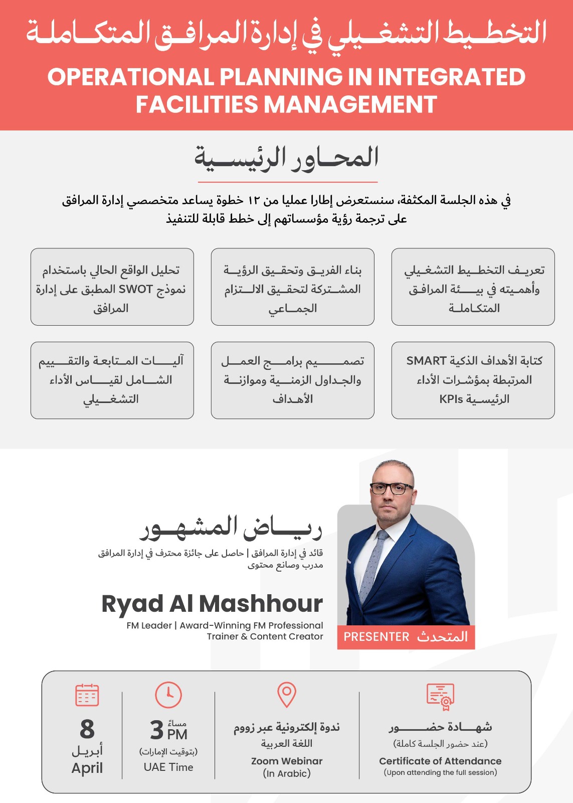 المهندس/ رياض المشهور هو محترف متميز في إدارة المرافق، يمتلك سجلا مهنيا غنيا يمتد لأكثر من 18 عاما في قيادة العمليات والتشغيل والصيانة وإدارة الأصول والعقود في مشاريع كبرى داخل دولة الإمارات. يشغل منصب مدير العمليات في أستيكو، ويمتاز برؤية عملية تجمع بين الخبرة الميدانية والنهج الاستراتيجي في تطوير الخدمات ورفع الكفاءة التشغيلية. كما يعد من الأسماء النشطة في نشر المعرفة المتخصصة في قطاع إدارة المرافق من خلال التدريب وصناعة المحتوى المهني والمشاركة في الفعاليات المتخصصة لدعم وتطوير قطاع إدارة المرافق.
